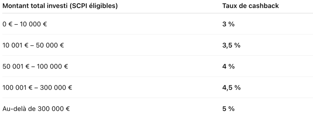 Le programme vise à récompenser les investisseurs qui souscrivent des parts de SCPI via le Portail immo-scpi.fr ou ses partenaires agréés, en leur versant un cashback selon les paliers définis ci-après.